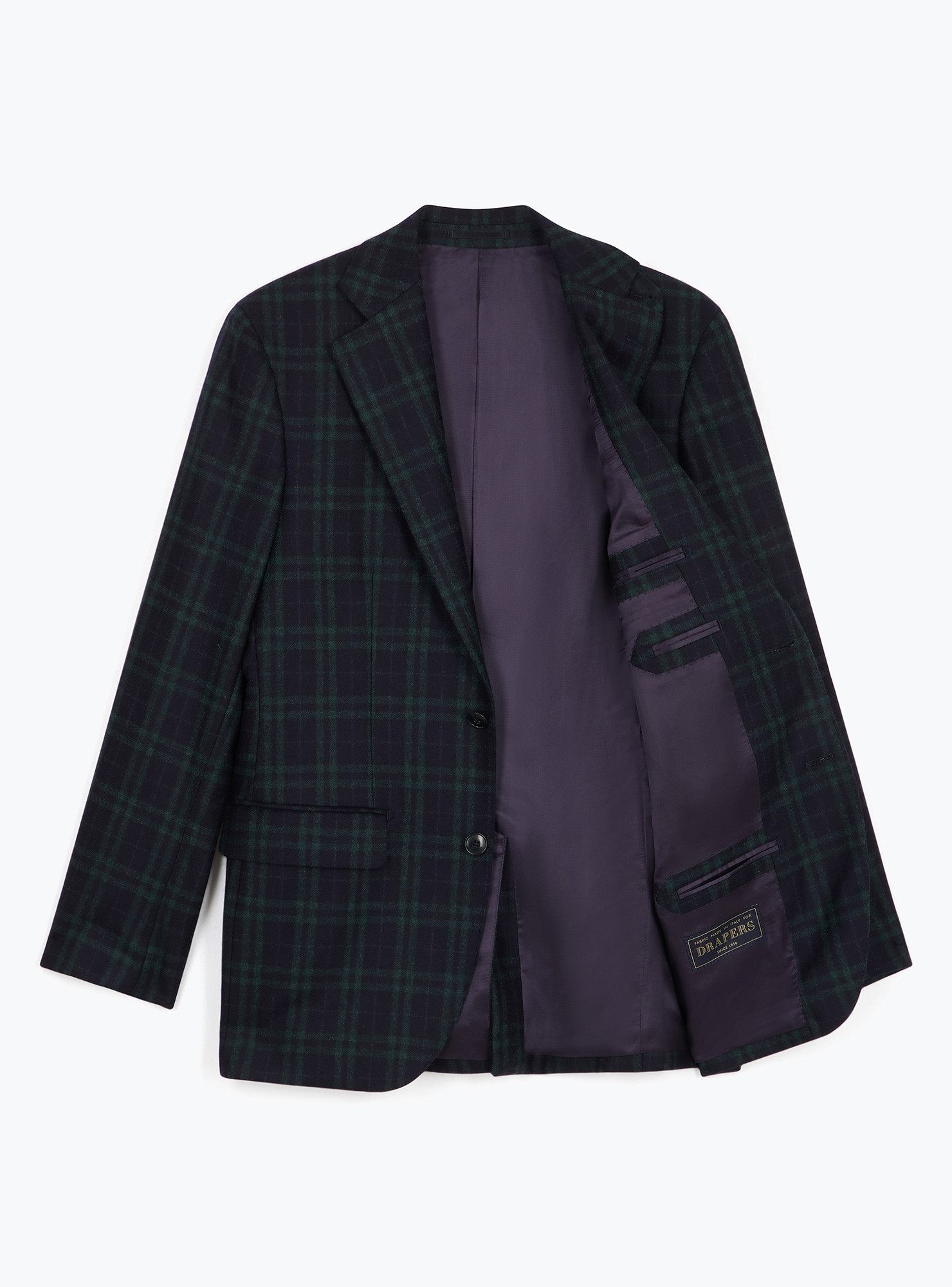 Navy blue and green Tartan 2-button jacket in wool flannel from Drapers. Traditional fit, shoulders with soft epaulets, 2 flap side pockets, 1 back slit and full inner lining.